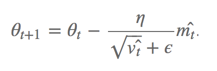 Comme indiqué ci-dessus, la règle de mise à jour d’Adam n’est qu’une version modifiée de la règle de mise à jour de Gradient descent. Chez Adam, l’EMA du premier moment du gradient échelonné par la racine carrée du deuxième moment du moment est substractée au vecteur paramètre θ.
